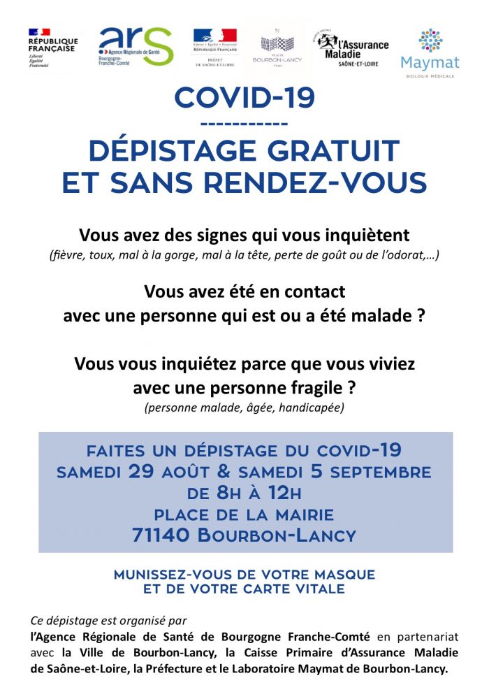 Des opérations de dépistages de la Covid-19, gratuites et sans rendez-vous, sont organisées par l’Agence régionale de santé de Bourgogne-Franche-Comté en partenariat avec les villes, la Caisse primaire d’assurance maladie de Saône-et-Loire, la Préfecture, et le laboratoire local.