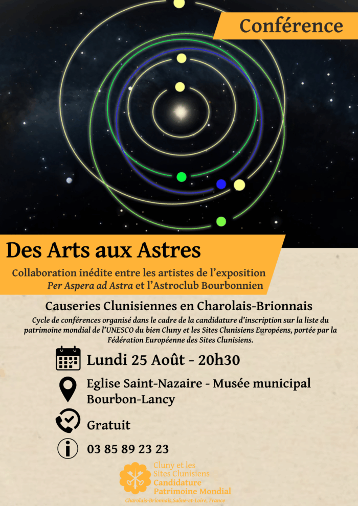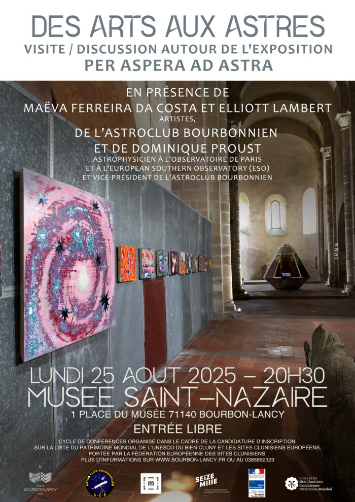 Lundi 25 Août 2025 à 20h30, les 2 artistes, Maëva FERREIRA DA COSTA et Elliott LAMBERT, seront accompagnés de Dominique PROUST, Astrophysicien à l’Observatoire de Paris et à l’European Southern Observatory, et de l’Astro club Bourbonnien pour une visite/discussion autour du thème de l’exposition.