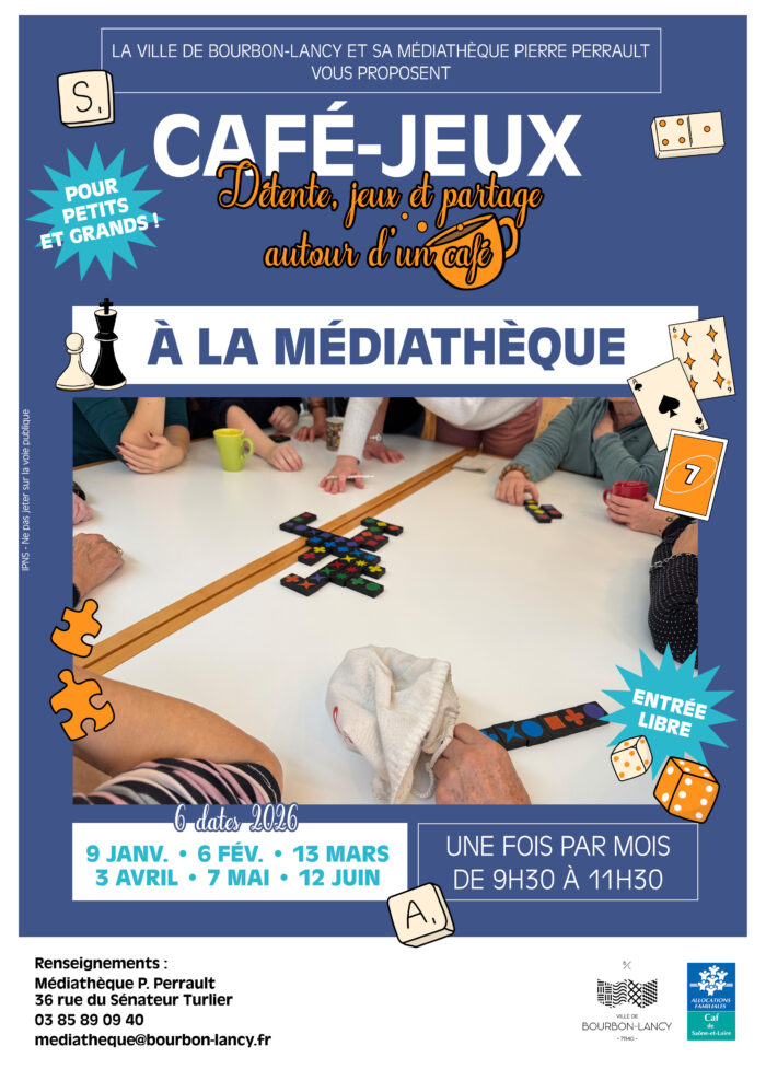 La Ville de Bourbon-Lancy et sa Médiathèque Pierre Perrault donnent rendez-vous aux familles et amis à un Café-Jeux à la Médiathèque.
