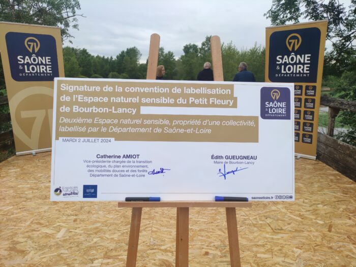 Mardi 2 juillet dernier, Edith Gueugneau, Maire, Marie-France Mauny, Conseillère départementale et Maire de Saint-Agnan, Catherine Amiot, Vice-Présidente du Département Transition écologique, plan environnement, mobilités douces et forêts, et Patrice Notteghem, Vice-président du Conservatoire Espace Naturel de Bourgogne, se sont réunis au Petit Fleury afin de signer la convention de labellisation de l’Espace naturel sensible (ENS) du site de Bourbon-Lancy.