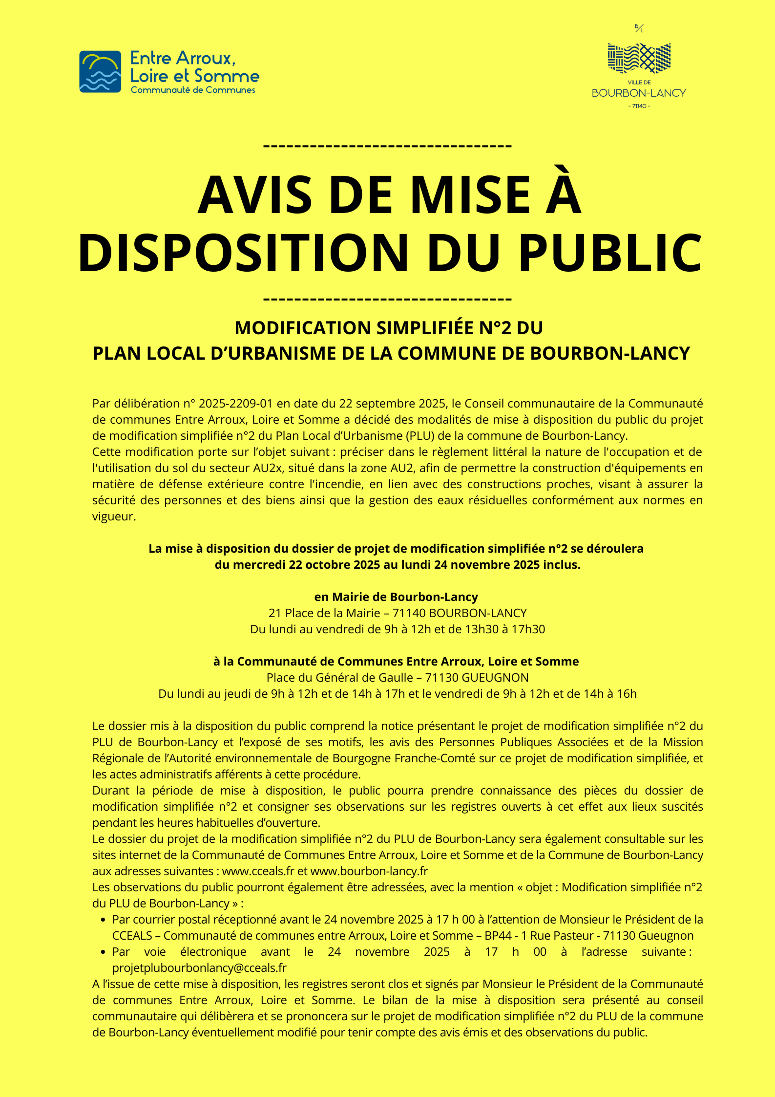 - Par voie électronique, avec la mention « objet : Modification simplifiée n°2 du PLU de Bourbon-Lancy », à l’adresse suivante : projetplubourbonlancy@cceals.fr