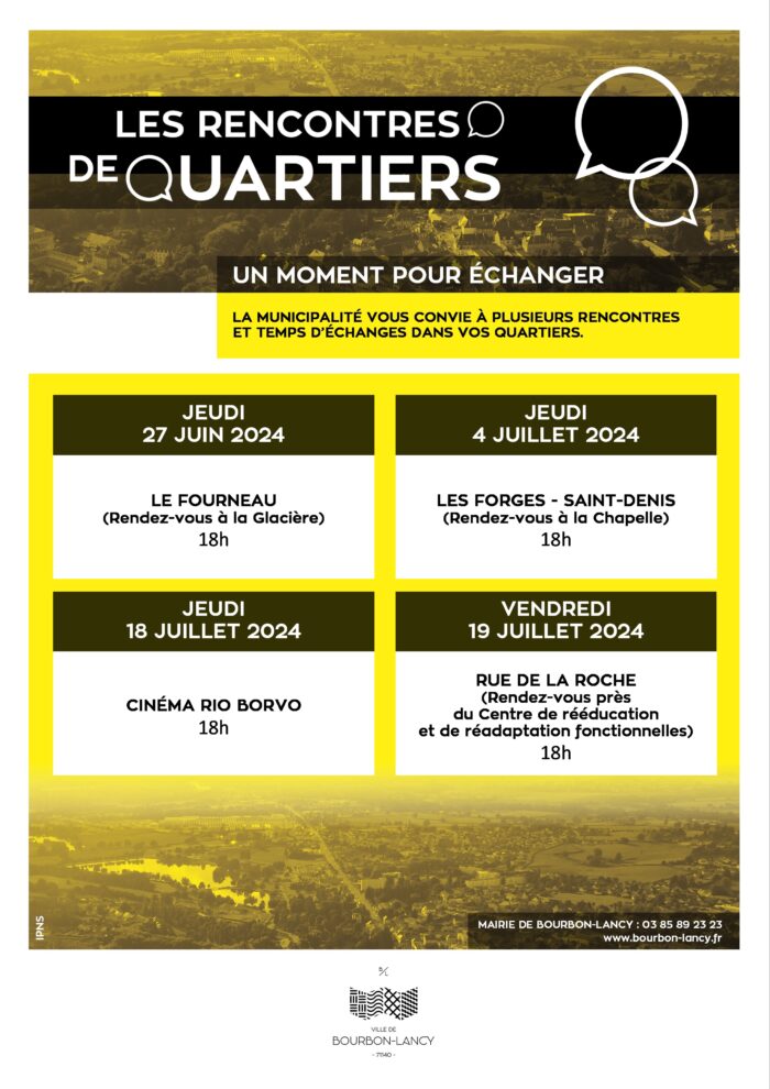 Les élus de Bourbon-Lancy vous convient à plusieurs rencontres de quartiers afin d’échanger avec vous autour des problématiques qui vous tiennent à cœur.