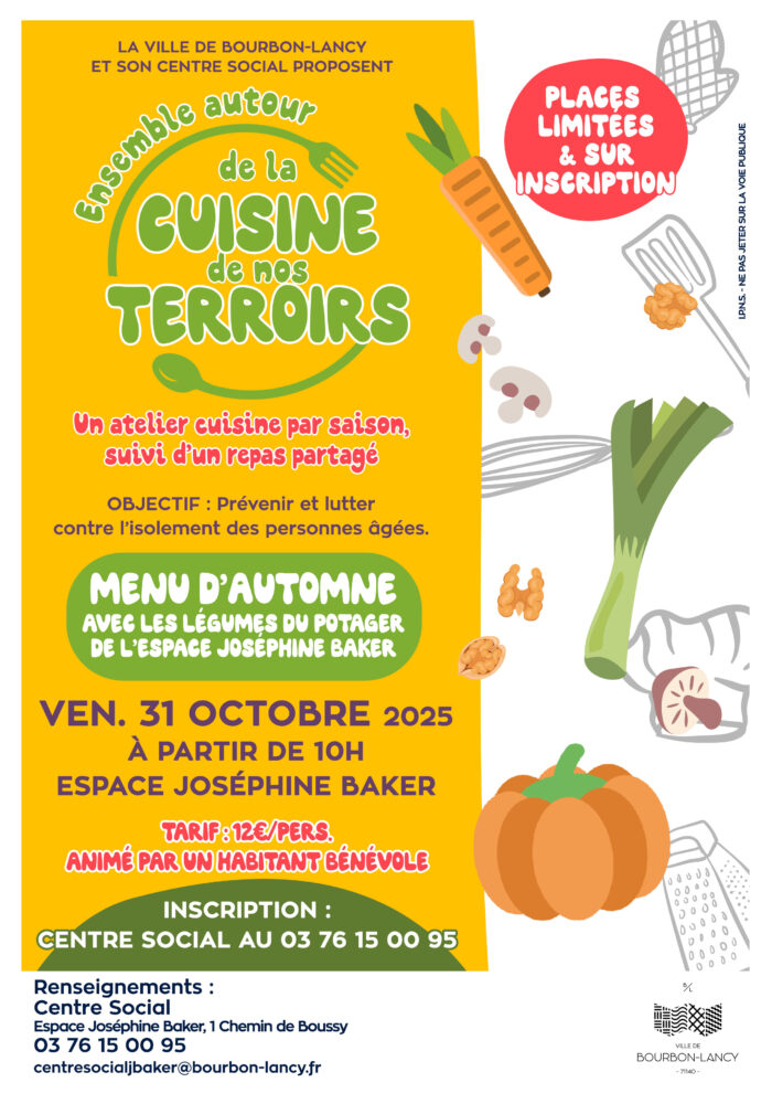 Venez participer à un atelier cuisine sur le thème de l’automne, suivi d’un repas partagé avec les légumes du potager de l’Espace Joséphine Baker. Un habitant bénévole sera là pour l’animer et vous accueillir vendredi 31 octobre 2025 dès 10h à l’Espace Joséphine Baker. 12€ par personne.