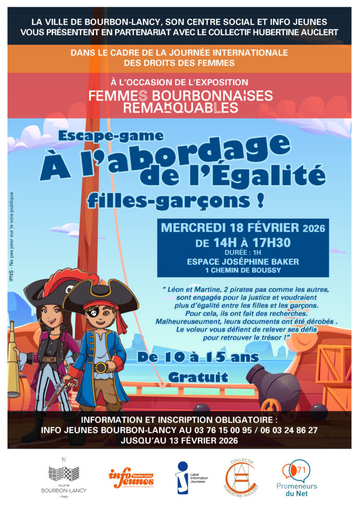 En effet, à l’occasion de l’exposition « Femmes bourbonnaises remarquables » organisée dès le 17 février à l’Espace Joséphine Baker, un escape game « A l’abordage de l’Égalité filles-garçons » sera animé mercredi 18 février 2026 de 14h à 17h30.