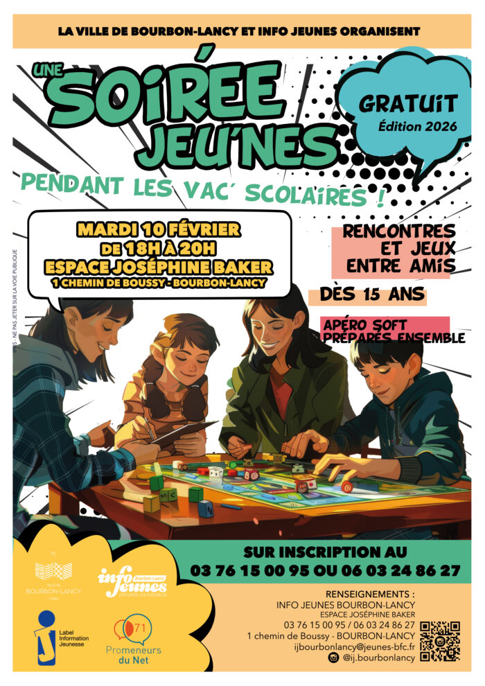 Info Jeunes Bourbon-Lancy organise une nouvelle soirée à partager entre jeunes de +15 ans à l’Espace Joséphine Baker.