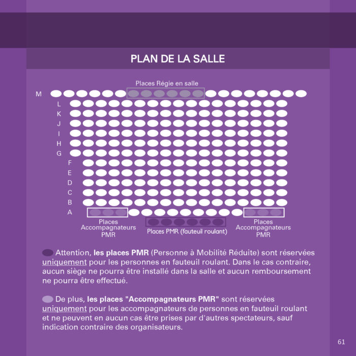 Toute place assise est numérotée. Les billets ne sont ni repris ni échangés sauf en cas d'annulation d'un spectacle.